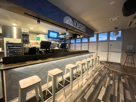 香椎アオハル店のオープンカウンター「KARAOKE BAL KASHII」は、明るく清潔感のある雰囲気が特徴の特別な空間です。ガラス張りの開放感あふれるスペースには、ステージとマイクスタンド、ミラーボールがあり、まるでライブのような気分でカラオケを楽しめます。外からもその楽しさが伝わり、訪れた瞬間からワクワク感が広がります。