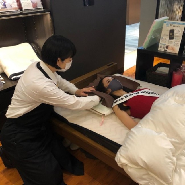 実は、2年前に腰を骨折をしてしまい、1年間の治療と休養を余儀なくされていたという根岸さん。現在は復帰されていますが、休養中、寝具の重要性を体感する機会がたくさんあったそうです。そんな折、まくらぼがミスワールドのファイナリストに提供している「オーダーメイド枕 プレミアム」でオーダーメイド枕制作の機会があり、「特別な枕になりました」と喜んでいただけました。(9月23日根岸さんSNS投稿より)