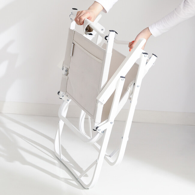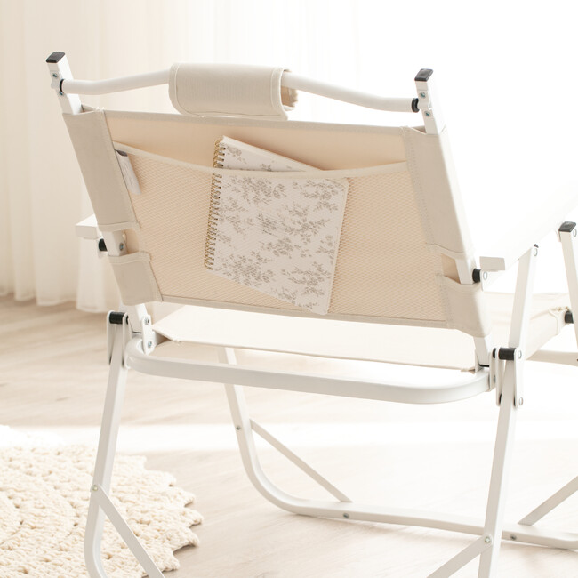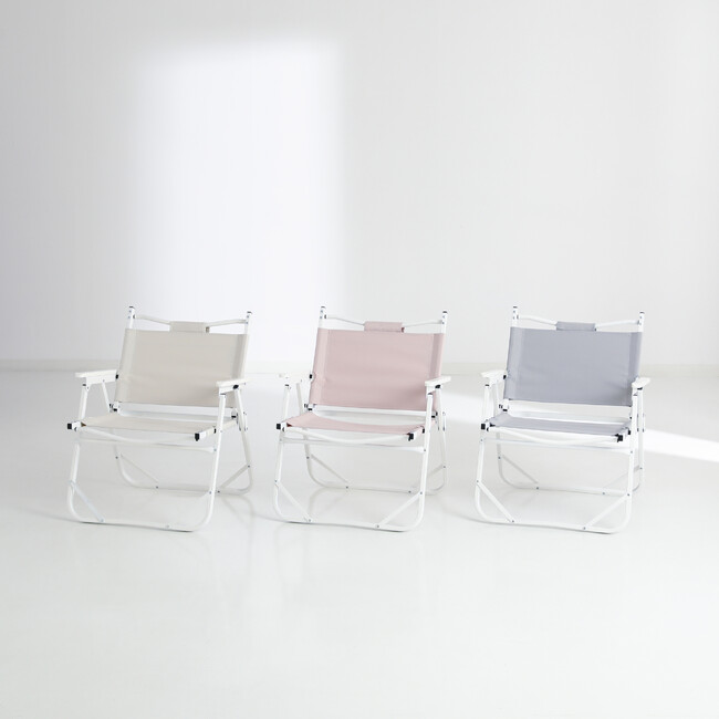 スマートな肘掛けがあり、リラックスして座ることができます。背もたれと座面を中央に引き寄せ、かんたんに折りたたんで持ち運ぶことができます。フレームの素材がアルミニウムで軽量なので、女性でも軽々お使いいただけるのが嬉しいポイントです。また、背面にはA4サイズが収納できるメッシュ素材のポケットが付いており、ちょっとした小物を収納できます。インテリアとしても違和感なくお使いいただけるよう、ホワイトカラーのフレームと落ち着いたカラーの張地を組み合わせました。日々の暮らしを快適にという想いを込めて『Brings comfort to your daily life』のメッセージをさりげなくタグにデザインしています。ちょっとしたスペースやべランピング、ピクニックやキャンプなど様々なシーンで活躍してくれるアイテムです。