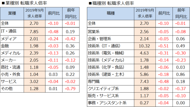 2019年9月の転職求人倍率は、前月比-0.10ポイントの2.70倍となりました。求人数は前月比100.2%、前年同月比 110.2%となりました。転職希望者数は前月比103.9%、前年同月比110.9%でした。