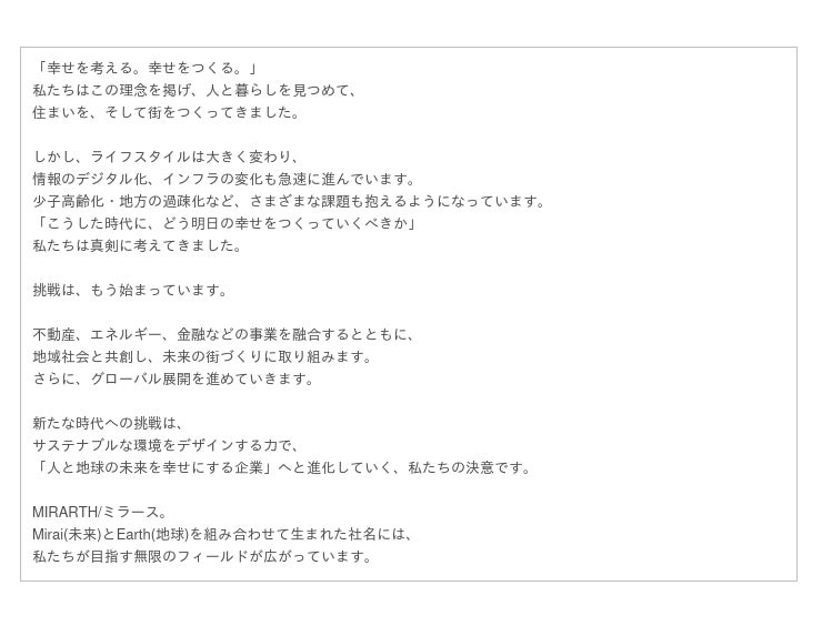 「MIRARTH(ミラース)ホールディングス株式会社」という新社名は、Mirai(未来)とEarth(地球)を組み合わせたもので、「不動産総合デベロッパー」の枠を超えて、「人と地球の未来を幸せにする未来環境デザイン企業」へ進化していく私たちの決意を込めたものです。