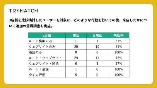 3店舗を比較検討したユーザーを対象に行った追加分析では、ウェブサイトの閲覧とルート検索を組み合わせた行動が最も高い来院率を示しました。