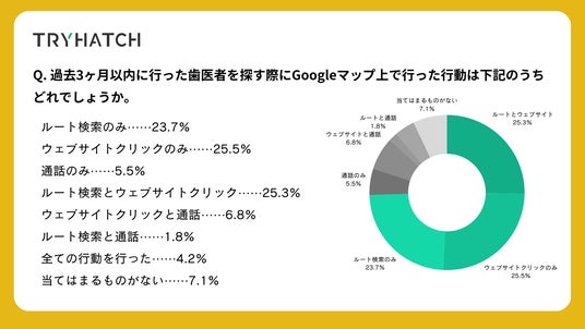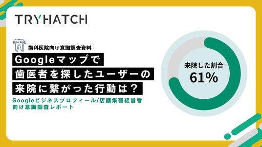 株式会社ベクトル(本社:東京都港区、代表取締役会長兼社長:西江 肇司、東証プライム:6058)の子会社である株式会社トライハッチ(東京都新宿区、代表取締役社長、武藤 尭行、以下、トライハッチ)は、Googleマップを利用して歯医者を検索したユーザー398名を対象にした行動傾向調査を実施しました。その結果、Googleマップ上で検索行動を行ったユーザーのうち61%が来院したと回答しました。また、検索行動の中で最も来院につながったのはウェブサイトクリックとルート検索の組み合わせであることがわかりました。