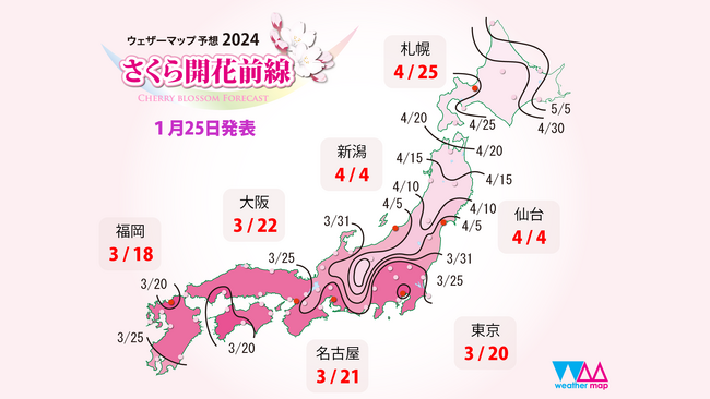 映像の企画から制作、映像編集、配信・流通向けサービスに至るまでを、グローバルにワンストップでお届けする株式会社IMAGICA GROUP(本社:東京都港区、代表取締役社長:布施 信夫)のグループ会社で、気象予報士の派遣や提供、気象データ、気象コンテンツの提供及び配信を手掛ける株式会社ウェザーマップ(本社:東京都港区、代表取締役社長:森 朗、以下「ウェザーマップ」)は、2024年の第一回「さくら開花予想」を発表しました。(九州~北海道 53地点)
