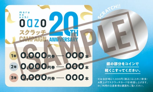 開業20周年を記念して、丸の内オアゾで使える金券が当たる、スクラッチキャンペーンを実施。期間中、各店舗にて1,000円(税込み)以上お買い上げで、スクラッチカードを配布します。