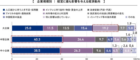 (1) 「経営に最も影響を与える経済動向」の設問では、中堅・中小企業は「人手不足」、大企業は「AI市場の拡大」が最多となりました。企業規模によって経営に対する影響要因が異なる実態が明らかになりました。