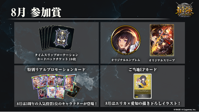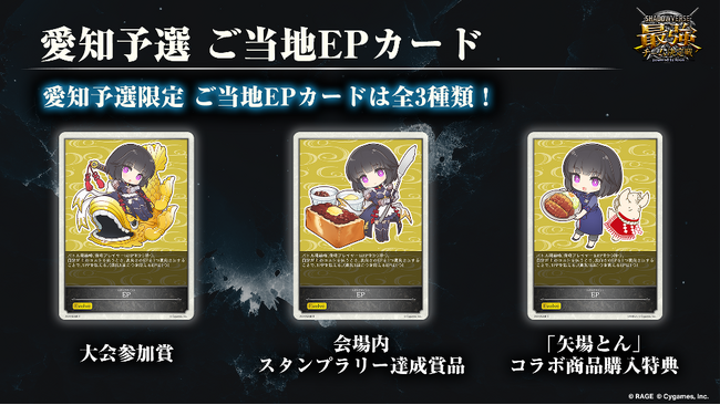 オフライン大会会場限定で完全新規で描き下ろしされた『Shadowverse EVOLVE』の「EPカード」が獲得できます。大会にあわせてカードに描かれるキャラクターが異なり、8月はエリカの愛知限定「ご当地EPカード」3種類が獲得可能です。