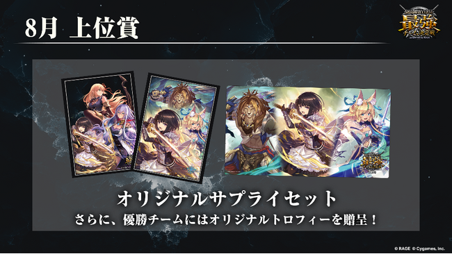 上位賞として優勝チームには、キービジュアルと同じデザインがあしらわれたクリスタルトロフィーをお渡しします。上位8名には、キービジュアルデザインのスリーブ2種とラバーマットを差し上げます。さらに、優勝チームはラバーマットに「チャンピオン」の文字が刻まれます。また、会場では本戦に参加しなくても楽しめる各種サイドイベントもご用意しております。詳細は後日公開いたします。