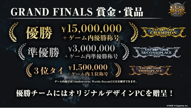 本大会の優勝チームには優勝賞金として1,500万円を授与いたします。またこの大会の上位入賞チームに送られるゲーム内称号については、『Shadowverse: Worlds Beyond(以下、シャドウバース ワールズビヨンド)』への引き継ぎが可能となっており、更に優勝チームには、『シャドウバース ワールズビヨンド』の「ルーム」にて飾ることのできる、ゲーム内「オリジナルトロフィー」も準備しております。そして、株式会社エルザジャパン様のご協力のもと、オリジナルデザインPCを優勝者3名分贈呈いたします。デザイン内容に関しては、後日発表いたします。