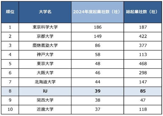 令和6(2024)年度におけるiUの起業数は39社と、全国8位です。