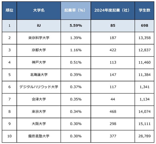 全員起業を掲げるiU、起業率は連続ダントツ首位。年間の起業数でも当校より上位は東科大、京大、東大ら有力国立大学と慶応で、新興の小規模校として異色の食い込みです。