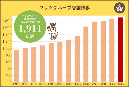 ワッツは2014年より店舗数を全国各地において増加させており、2026年3月末時点にて、全国店舗数1,911店舗を達成いたしました。今後も皆様に便利な日用品・生活雑貨をお届けするため、全国各地に積極的な新規出店を計画しています。