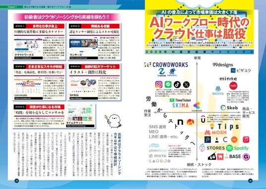 AIワークフロー時代のクラウドソーシングにも言及。新しい仕事の傾向や、副業を最大化する秘訣、そして2026年の副業マトリックスでわかりやすく解説しています。