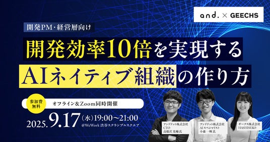 ギークス株式会社(本社:東京都渋谷区、代表取締役CEO:曽根原 稔人、以下ギークス)は、2025年9月17日(水)19:00~21:00にて、ITエンジニア・ITエンジニア採用担当者に向けたセミナー「開発効率10倍を実現するAIネイティブ組織の作り方」を開催します。