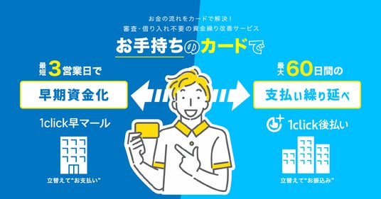 「1click早マール」とは、請求書をカードで支払うことによる売掛金の早期回収サービスです。“売り手”は売掛金の早期回収のために、“買い手”に入金希望日の3営業日前までにカード払いを依頼することで、通常の支払い期限よりも早く資金化が可能となります。“売り手”の早期資金化、“買い手”の支払い延長(※1)という両方のニーズを満たすサービスとなります。