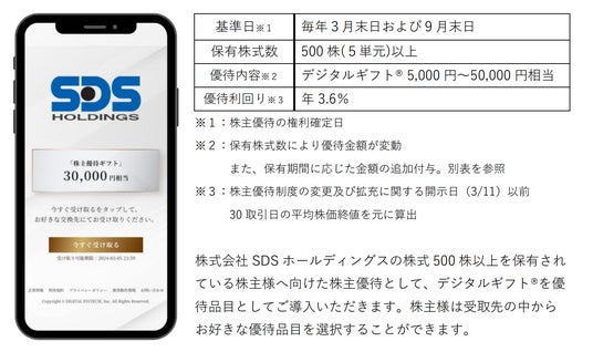 株式会社SDSホールディングス(代表取締役社長:渡辺 悠介、東証スタンダード:証券コード 1711)において、株式会社デジタルプラス(4EE3表取締役社長:菊池 誠晃、本社:東京都渋谷区、東証グロース市場:証券コード3691)グループが運営する「デジタルギフト(R)」を株主優待としてご活用いただくことになりました。