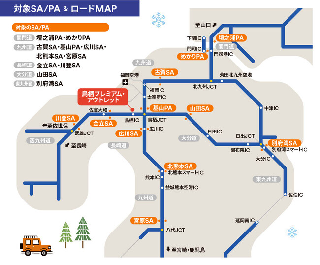 長崎自動車道:金立SA(上下)、川登SA(上下) 大分自動車道:山田SA(上下)