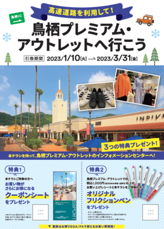 鳥栖プレミアム・アウトレット(所在地:佐賀県鳥栖市 運営:三菱地所・サイモン株式会社)は、西日本高速道路サービス・ホールディングス株式会社 九州支社(所在地:福岡県福岡市)と連携し、2023年1月10日(火)~3月31日(金)の期間、「高速道路を利用して鳥栖プレミアム・アウトレットへ行こう」キャンペーンを開催します。