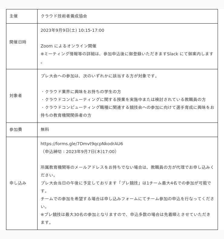 「クラウドエンジニア フェスティバル 2023(第4回プレ大会 2023~WorldSkills 2026 中国・上海大会へのロードマップ~(以下、プレ大会))」は、日本国内においてクラウドエンジニアの裾野を広げる活動の一環として、教育機関所属の学生・教職員の方を対象にクラウド業界の動向を知ること及び技能五輪国際大会クラウドコンピューティング職種の競技を体験する機会の提供を目的として実施します。