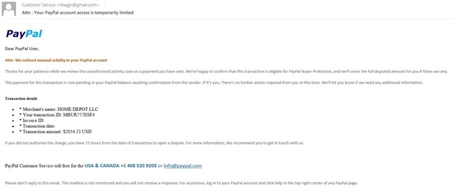図1:高額な購入を知らせる、偽のPayPalからの通知。キャンセルする場合はカスタマーサポート宛に電話かメールするように促している