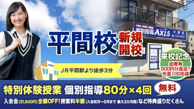この機会に、新たに仲間入りした「個別指導Axis平間校」をご利用ください。新校舎の見学や学習相談は、いつでも承っております。