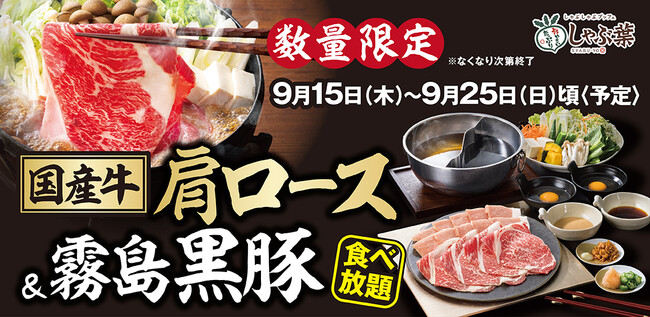 株式会社すかいらーくレストランツ(本社・東京都武蔵野市、代表取締役社長 中島 尚志)が運営する「しゃぶ葉」では、2022年9月15日(木)より、数量限定で「国産牛肩ロース&霧島黒豚 食べ放題コース」を販売。同日より、家族全員で楽しめる「超!シルバーウィークキャンペーン」を実施いたします。