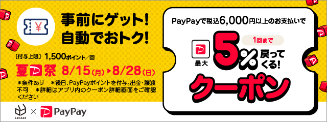 「夏のPayPay祭」は、全国のPayPay加盟店とオンラインショップでお得に買い物をお楽しみいただける大規模キャンペーンです。LOHACO 本店がキャンペーンに参加する対象期間中、事前にPayPayアプリ上でクーポン(※2)を取得の上、LOHACO本店にてPayPayで6,000円(税込)以上お買い物いただくと決済金額の最大5%(付与上限:1500ポイント/回)のPayPayポイントが後日、自動的に付与されます。