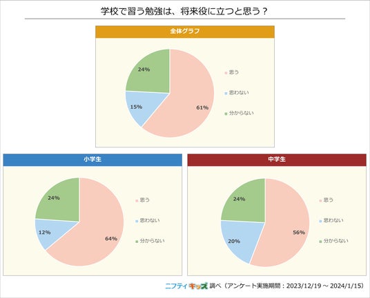 学校の勉強について、半数以上の人が将来の役に立つと「思う」と答えました。