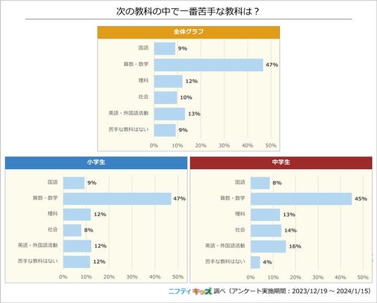 小学生・中学生ともに、苦手な教科は「算数・数学」が1位でした。小学生で47%、中学生で45%とどちらも半数近くの人が苦手意識をもっています。