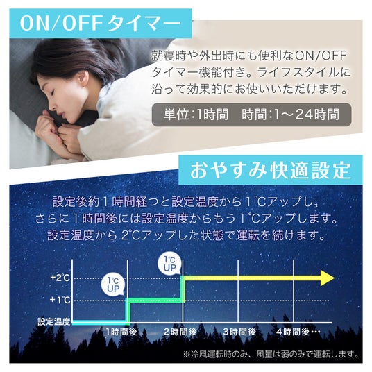ON/OFFタイマーは1時間単位で設定でき、最大24時間まで設定できます。また、おやすみ設定を行うと、設定温度が1時間後に1℃上昇し、2時間後にさらに1℃上昇し、12時間経過すると電源が自動的にOFFになります。これらの機能で、のどの痛みや風邪の原因と言われている、冷房のつけっぱなしを回避することができます。