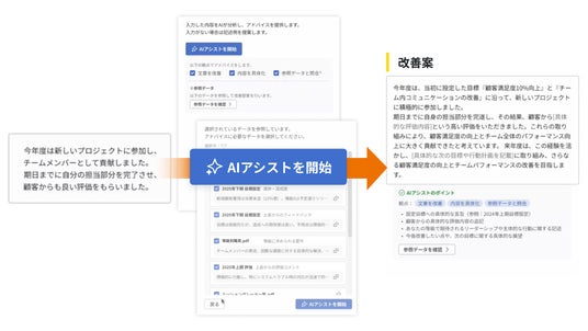 AIにより、文章の”てにをは”や誤った記述を修正する校正機能に加え、従業員の目標設定に対して強力なアシストを図ります。