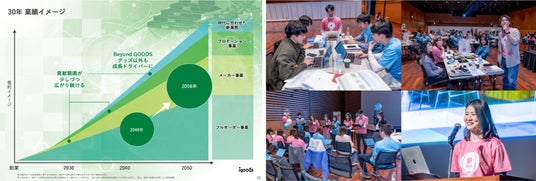 (左)2050年までの事業ビジョン/(右)経営方針発表会の様子