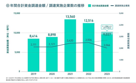 国内スタートアップの資金調達環境は、アメリカ中央銀行の利上げなどを背景に2021年末ごろから調整局面に突入したとされます。2022年は長めのランウェイを確保する動きや、デットファイナンスをはじめとする調達手法の多様化などが進み、1兆円規模を保ちました。23年上半期から減少傾向が顕在化し始めていました。
