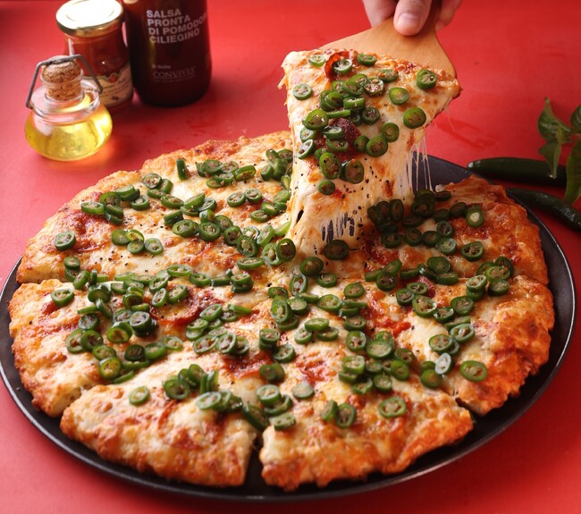 サラミの旨みとセラーノペッパーの痺れる旨辛な美味しさはそのままご堪能いただける限界まで、挑戦いたしました。