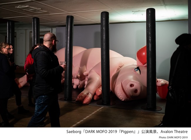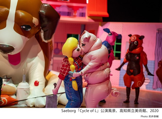 半分人間で、半分玩具の不完全なサイボーグとして、人工的であることによって、性別や年齢などを超越できると捉えるラテックス製のボディスーツを自作し、パフォーマンスとインスタレーションを国内外で展開する。カラフルで、デフォルメされた雌豚や牝牛などの家畜や害虫などが繰り広げるパフォーマンスは一見明るく楽し気だが、人間の残酷性や消費の問題のみならず、人間社会における介護やケアの問題にも接続し、強者/弱者、支える側/支えられる側という二項対立ではおさまらない、多様性の受容、共生の問題に発展させている。