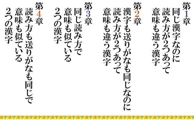 「同じ漢字なのに、読み方が2つあって、意味も違う漢字」「同じ読み方で、意味も似ている2つの漢字」