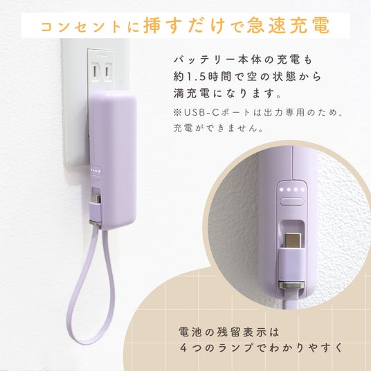 コンセントがない場所でも最大20Wの急速充電対応で、スピーディーな充電が可能です。