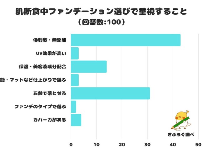 肌断食中ファンデーション選びで重視することをアンケートにて調査したところ、1位は「低刺激・無添加」でした。