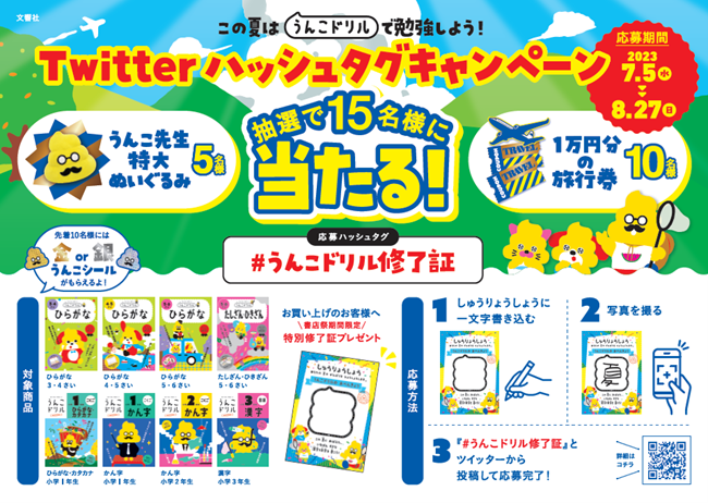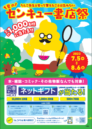 株式会社文響社(本社:東京都港区、代表取締役:山本周嗣)は、2023年7月5日(水)より日本出版販売株式会社(略称:日販)主催の販促企画「書店祭」の一環として、「うんこドリル」シリーズ(文響社)とコラボレーションしたキャンペーン「夏のセンキュー書店祭 ~うんこ先生と笑って覚えたことは忘れない~」に協賛いたします。( https://hon-hikidashi.jp/event/8774/ )
