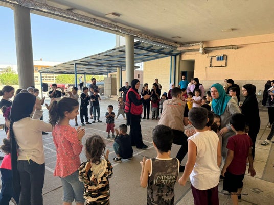 避難所で、子どもたちに心理社会的支援や楽しくすごせる機会を提供するワールド・ビジョン・スタッフ