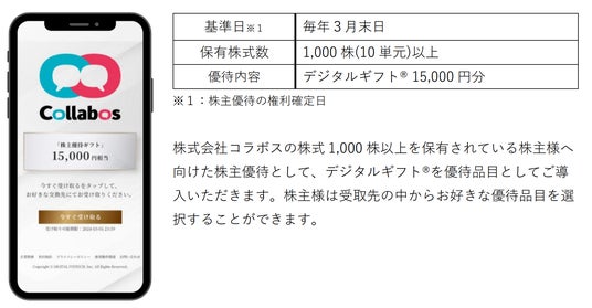 株式会社コラボス(代表取締役社長:茂木 貴雄、東証グロース:証券コード 3908)において、株式会社デジタルプラス(代表取締役社長:菊池 誠晃、本社:東京都渋谷区、東証グロース市場:証券コード3691)グループが運営する「デジタルギフト(R)」を株主優待としてご活用いただくことになりました。