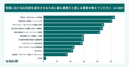 AI活用を成功させるために最も重要だと感じる要素を聞いたところ(n=389)、最も多かった回答は「学習データの入力ルールの徹底」(13.6%)、つまり学習データの量と質の確保でした。
