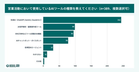 実際に業務で使用しているAIツールの種類を聞いたところ(n=389、複数選択可)、最も多かった回答は「生成AI」となりました。 まずはChatGPTやGeminiをはじめとする汎用的な生成AIが、営業現場の効率化ツールとして定着していることがわかりました。