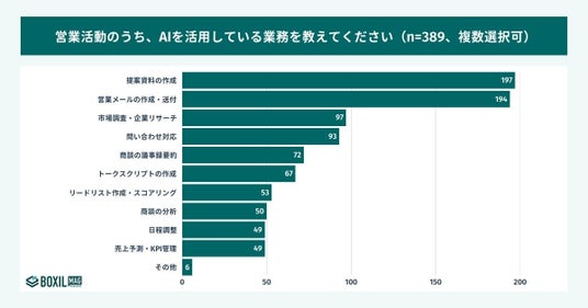 - AIを活用している業務として最も多いのは「提案資料の作成」。次いで「営業メールの作成・送付」