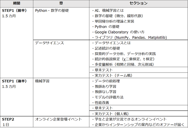 大学生がAI・データサイエンスを活用するための専門スキルを習得できるよう、技術習得だけではなく、ビジネスでの活用を想定した実践的なワークなどを取り入れた、3カ月間のオリジナルのカリキュラムを提供します。また、スキルを保持した学生を採用したい企業と学生との交流イベントも開催し、育成から適切な職種・業界・企業選びまでをワンストップで支援します。