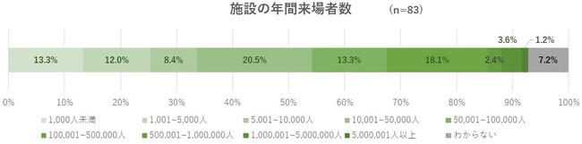 まず、今回のアンケート対象となった83施設の施設規模(年間来場者数)について。