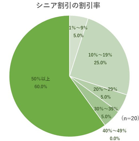 6割の施設が「50%以上」と回答。シニア割を実施している多くの施設が「通常料金の半額以下」と設定されているようです。次点で「10%~19%」引きが25%という結果でした。