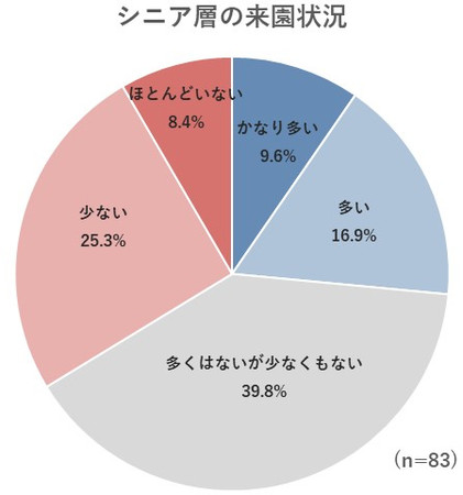 施設のジャンルや形態によってシニア層の来園状況は様々かと思いますが、今回回答してくださった施設では「多くはないが少なくもない」という施設が39.8%、「多い」が16.9%、「少ない」が25.3%でした。