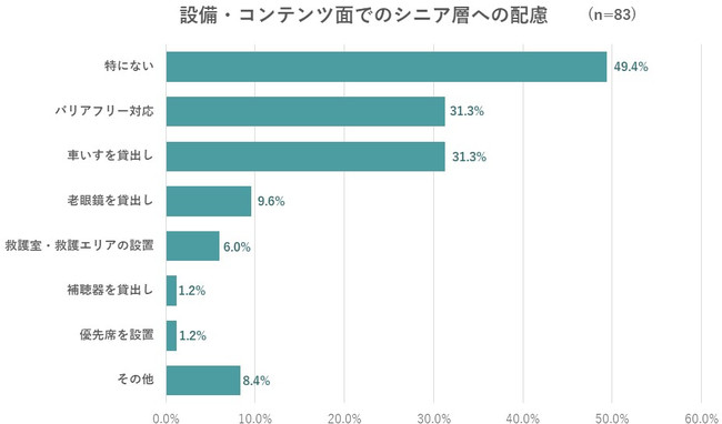 こちらも「特にない」が最多で49.4%。一方、3割の施設が「バリアフリー対応」や「車いすの貸出し」などをおこなっており、さらに“シニア層に向けて”10%弱の施設が「老眼鏡の貸出し」を実施されています。小さい文字を読む機会があるような施設の場合、目の悪い方でも不自由なく楽しむ事ができて、とても助かるサービスになっているのではないでしょうか。