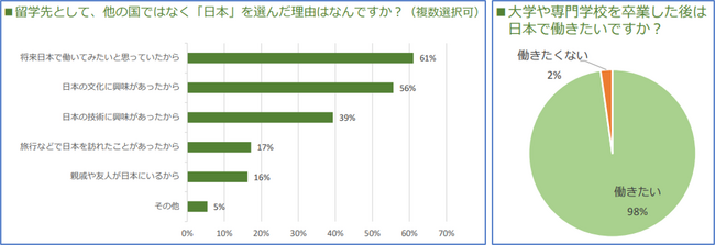 当社では、日本語学校に在籍し、卒業後に大学等高等教育機関への進学を目指す外国人留学生へ進路希望アンケートを実施(※1)、回答者の98%が「卒業後は日本での就労を希望」を選択しています。